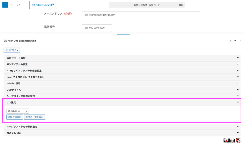 また、「お問い合わせ」ページでは(同じお問い合わせページへのリンクになる為)、「CTA」を非表示にしています。編集画面下にある「CTA設定」のボックスにて表示設定が可能です。