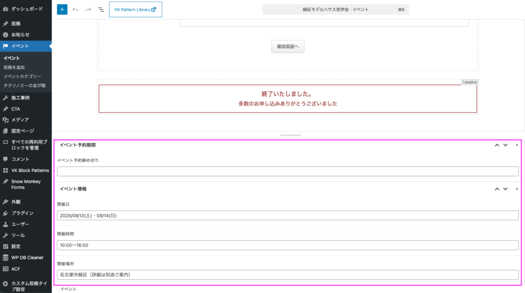 さらに、開催日・時間・場所といったイベント情報を簡単に入力できるように、カスタムフィールド(ACF)を活用。